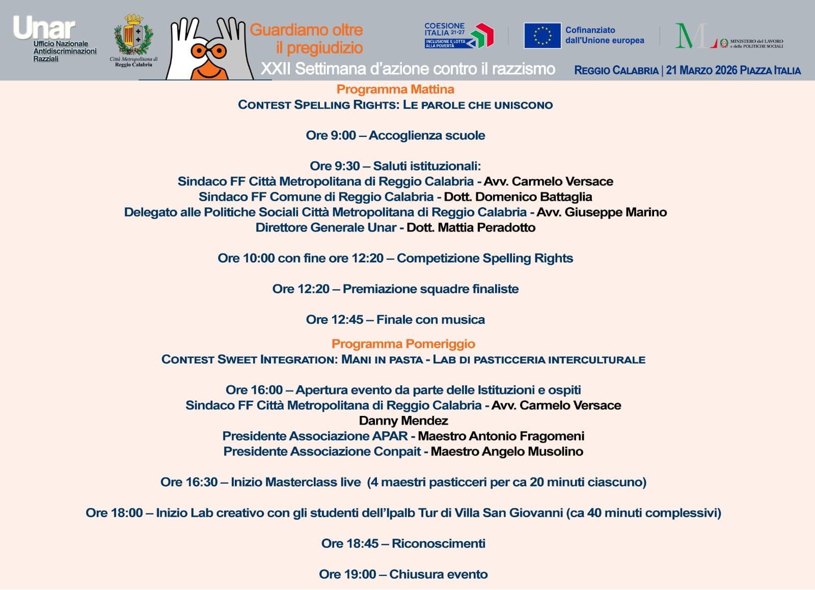 L’appuntamento sarà aperto dal Sindaco facente funzioni della Città Metropolitana di Reggio Calabria, Carmelo Versace, e vedrà la partecipazione del Sindaco facente funzioni del Comune di Reggio Calabria, Domenico Battaglia, del Direttore Generale dell’Unar Mattia Peradotto e del Consigliere metropolitano delegato Giuseppe Marino.